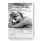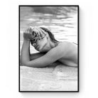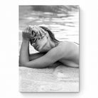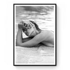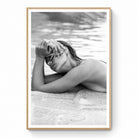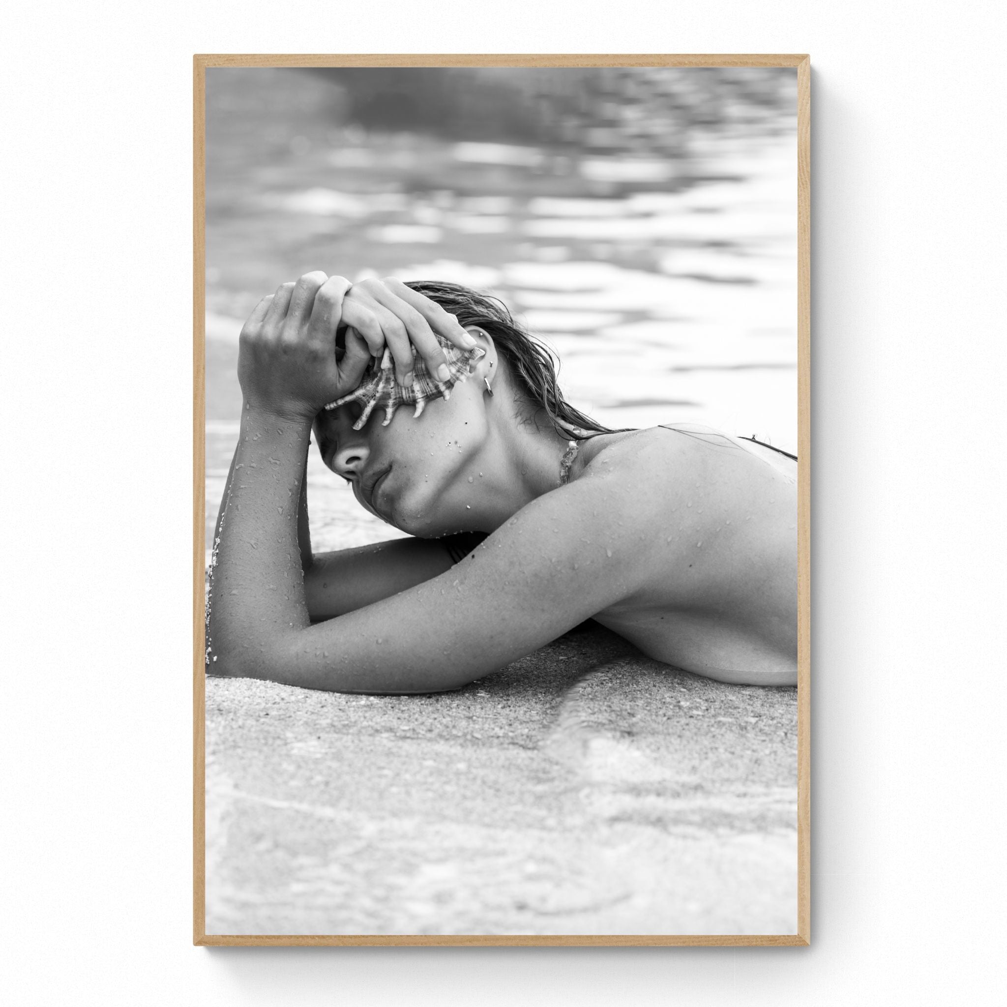 Relaxed and bathing in sunlight, the gentle rhythm of the waves whispers around her, embodying pure serenity.