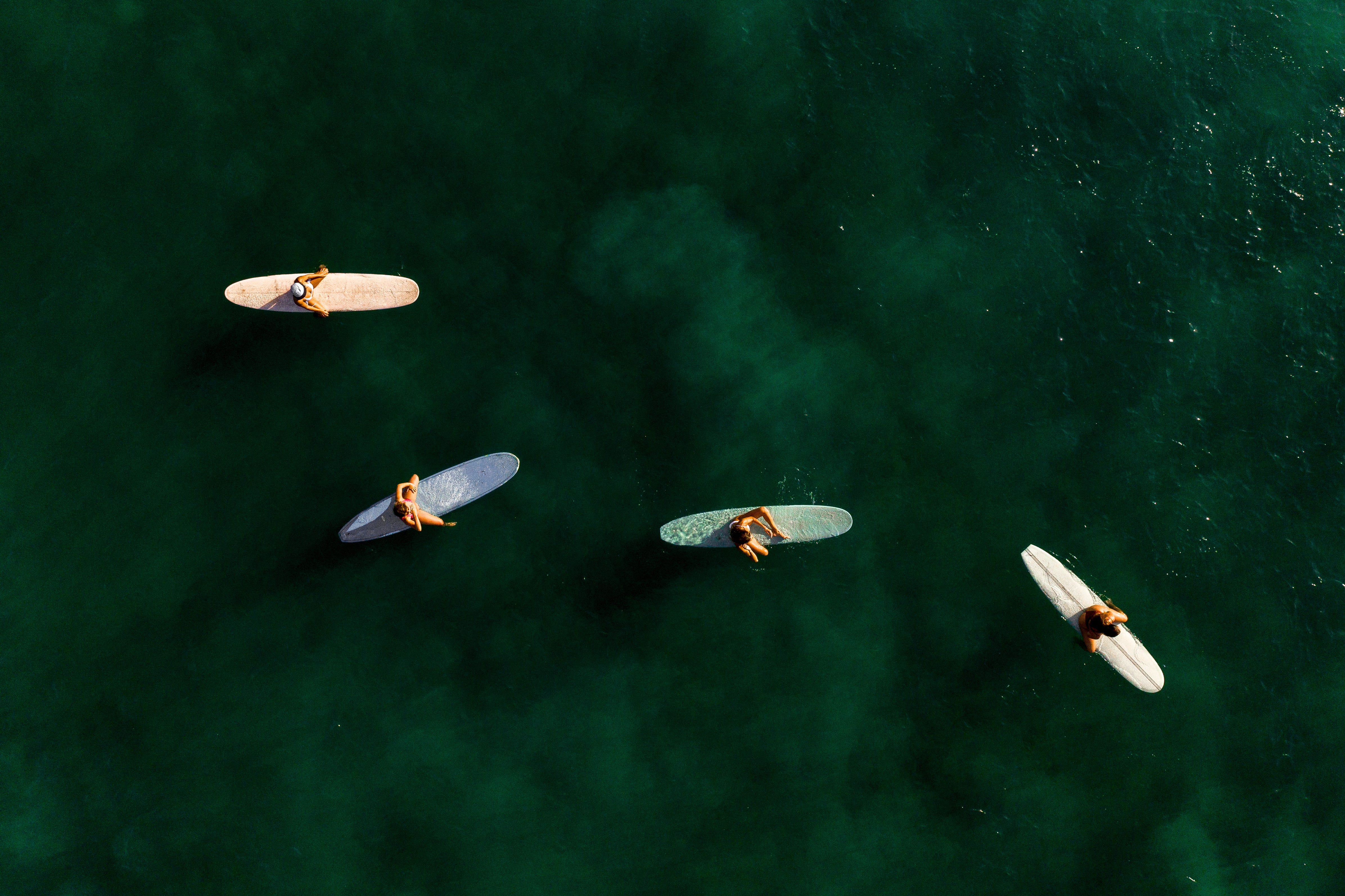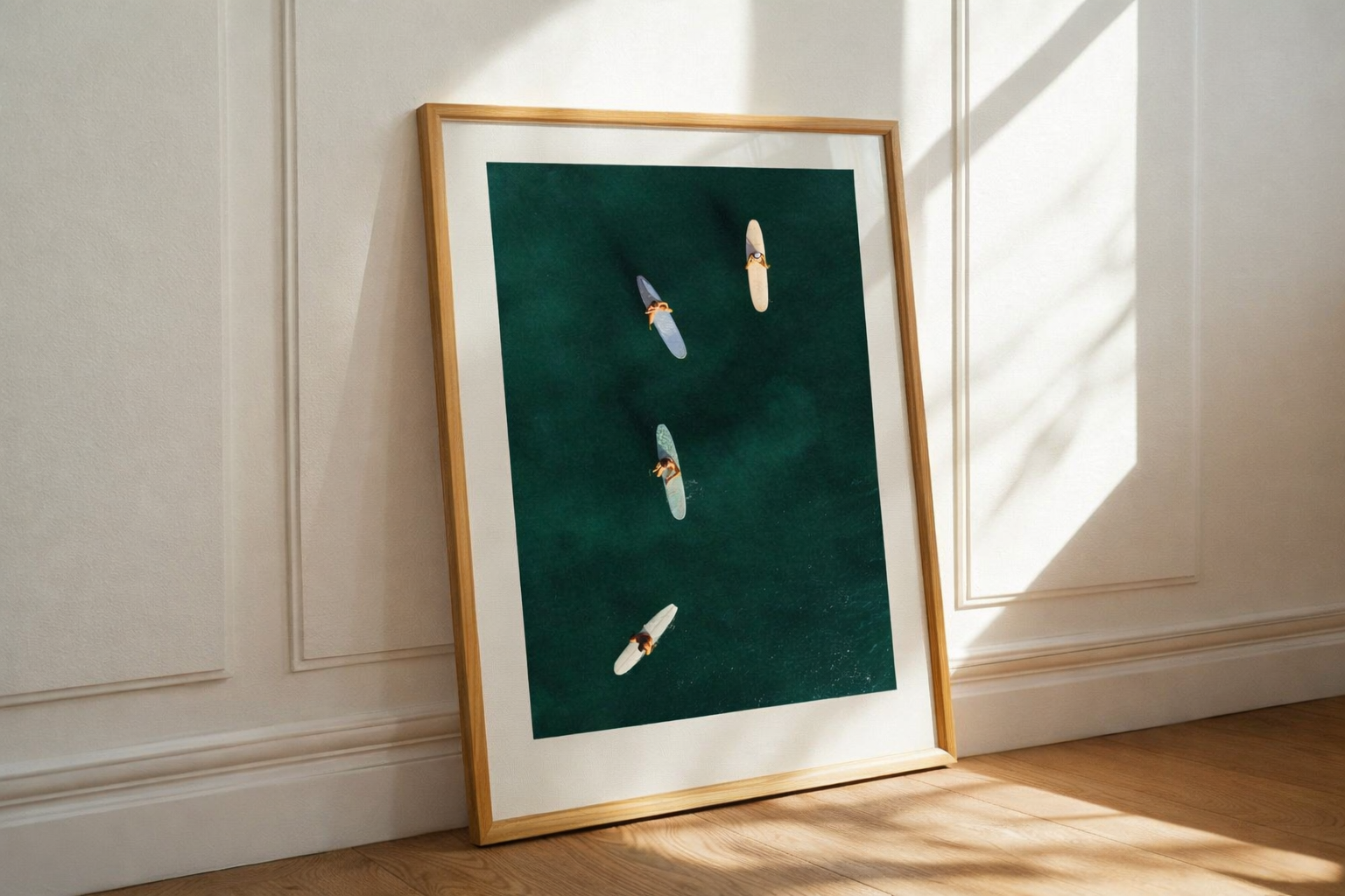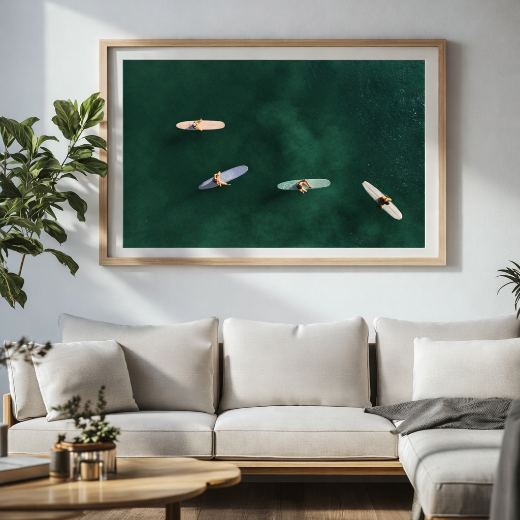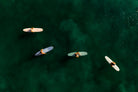 Four surfers drift in still, emerald water, suspended between patience and possibility. Floating in quiet alignment, reminding us that life isn’t only in the rush forward, but in the stillness where presence, patience, and meaning live.