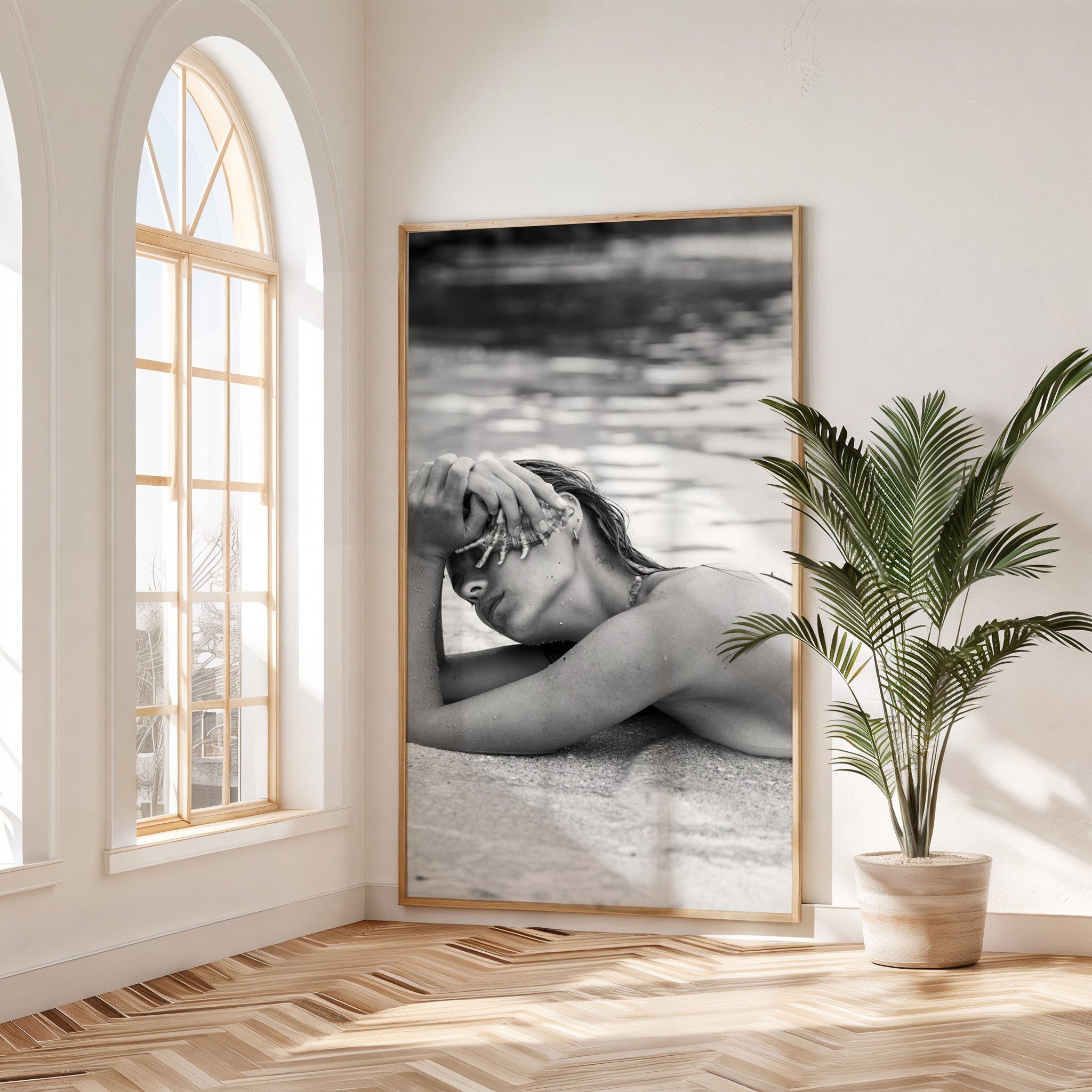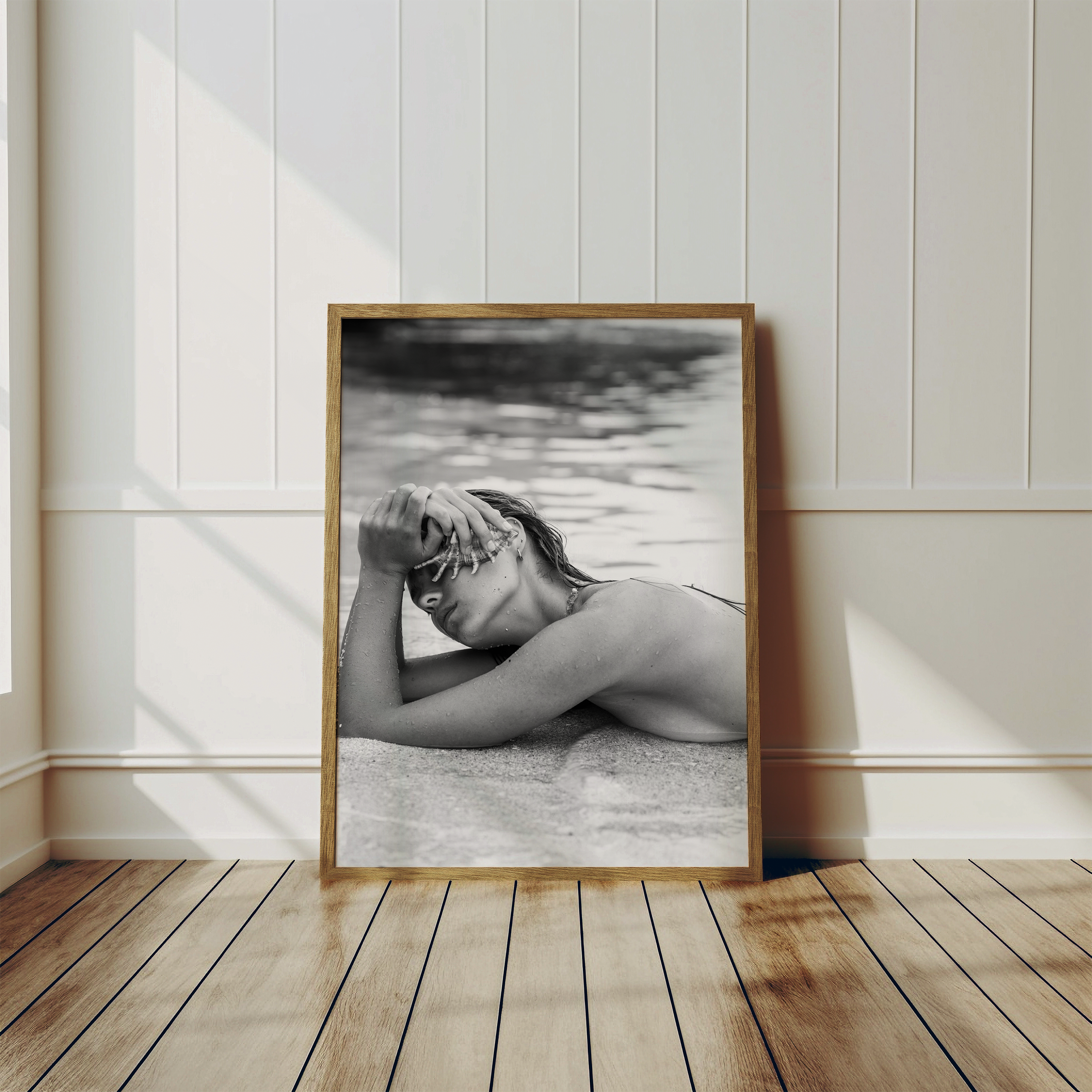 Relaxed and bathing in sunlight, the gentle rhythm of the waves whispers around her, embodying pure serenity.