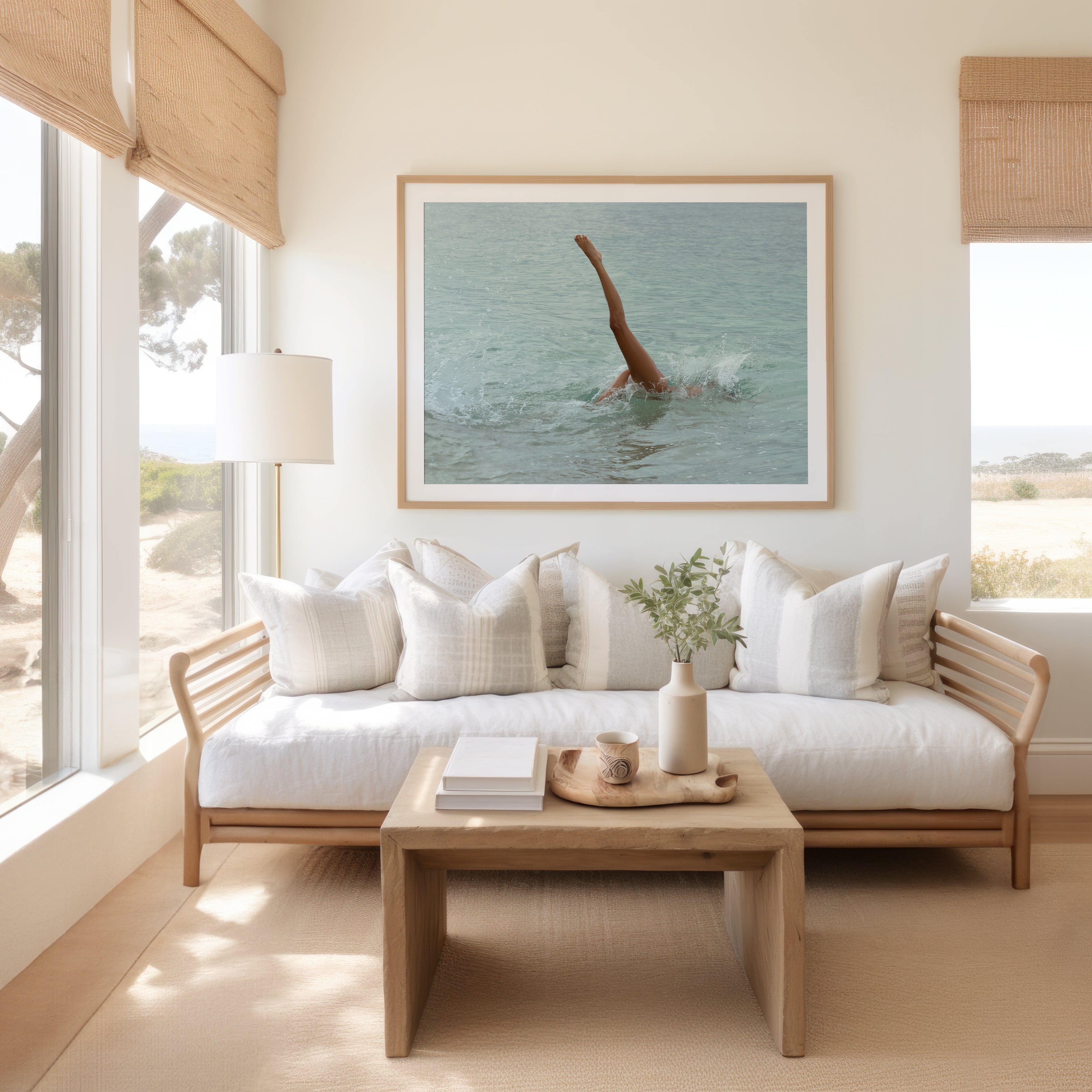 She took a breath and plunged forward, slicing through the sunlit surface of the warm Bali ocean, her body disappearing into the embrace of the turquoise depths as the water shimmered around her.