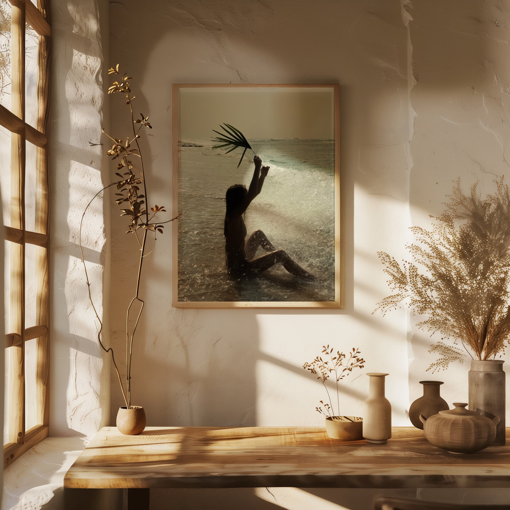 The Wave, a girl sits at the shoreline of a beautiful Bali beach as a playful wave crashes over her, drenching her in sunlit droplets. The ocean sparkles around her, the salty breeze tangling in her hair, as she surrenders to the joy of the moment.