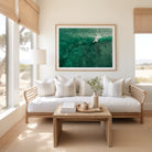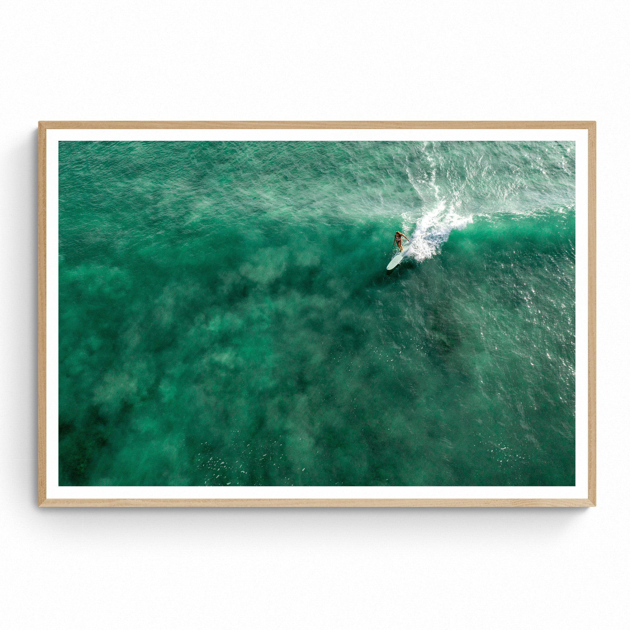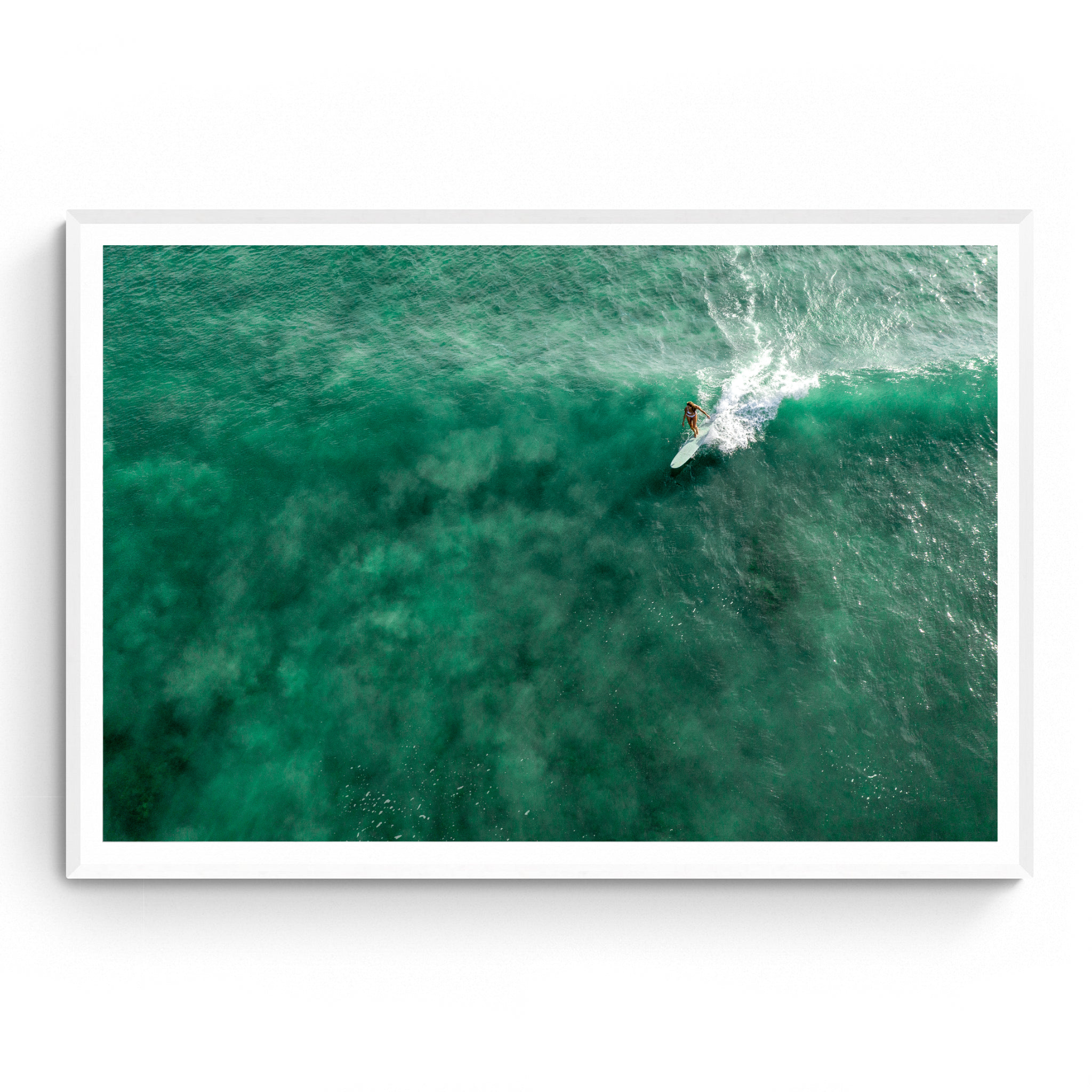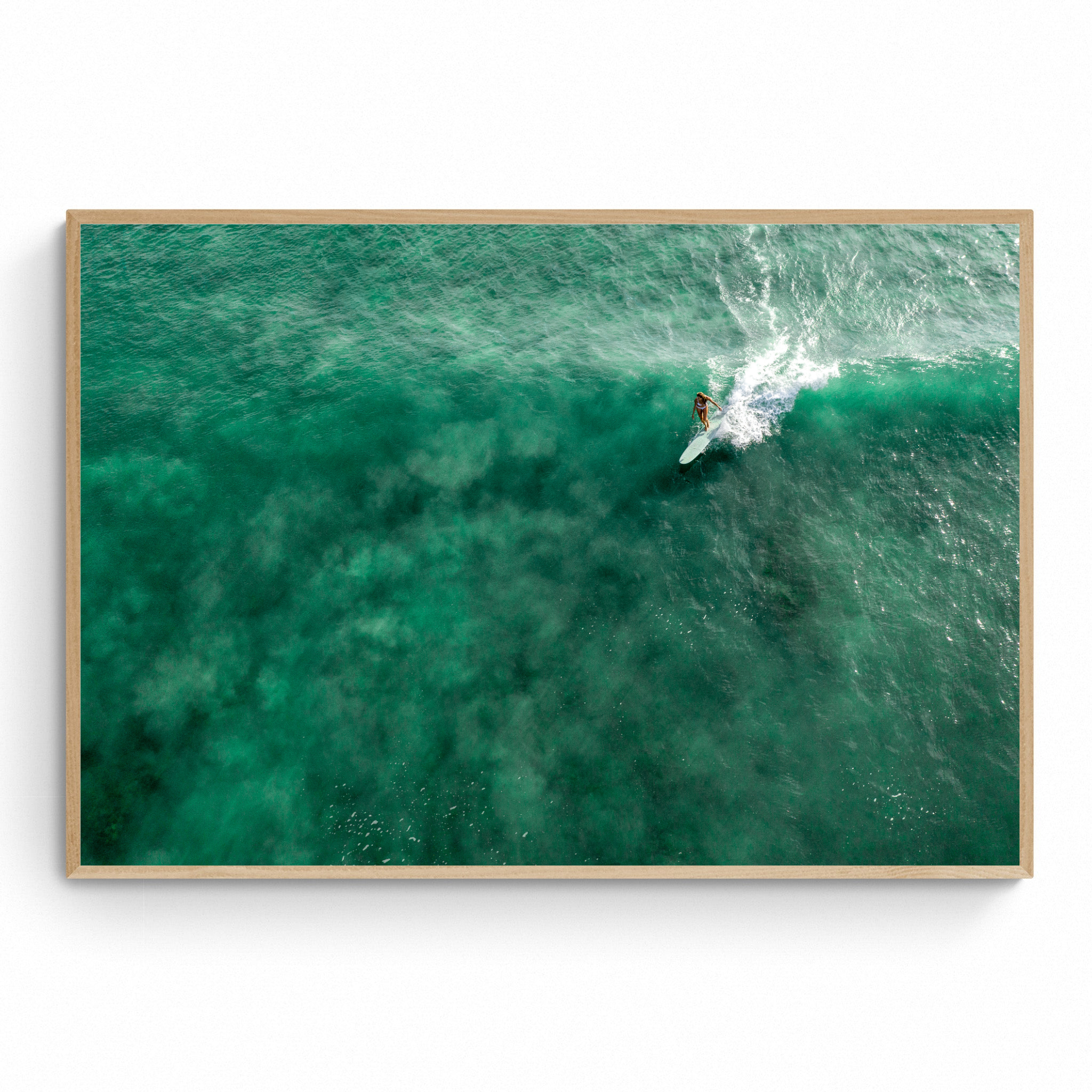 The Solo Surfer glides gracefully across Sayulita's emerald waves, a serene connection between human and ocean.