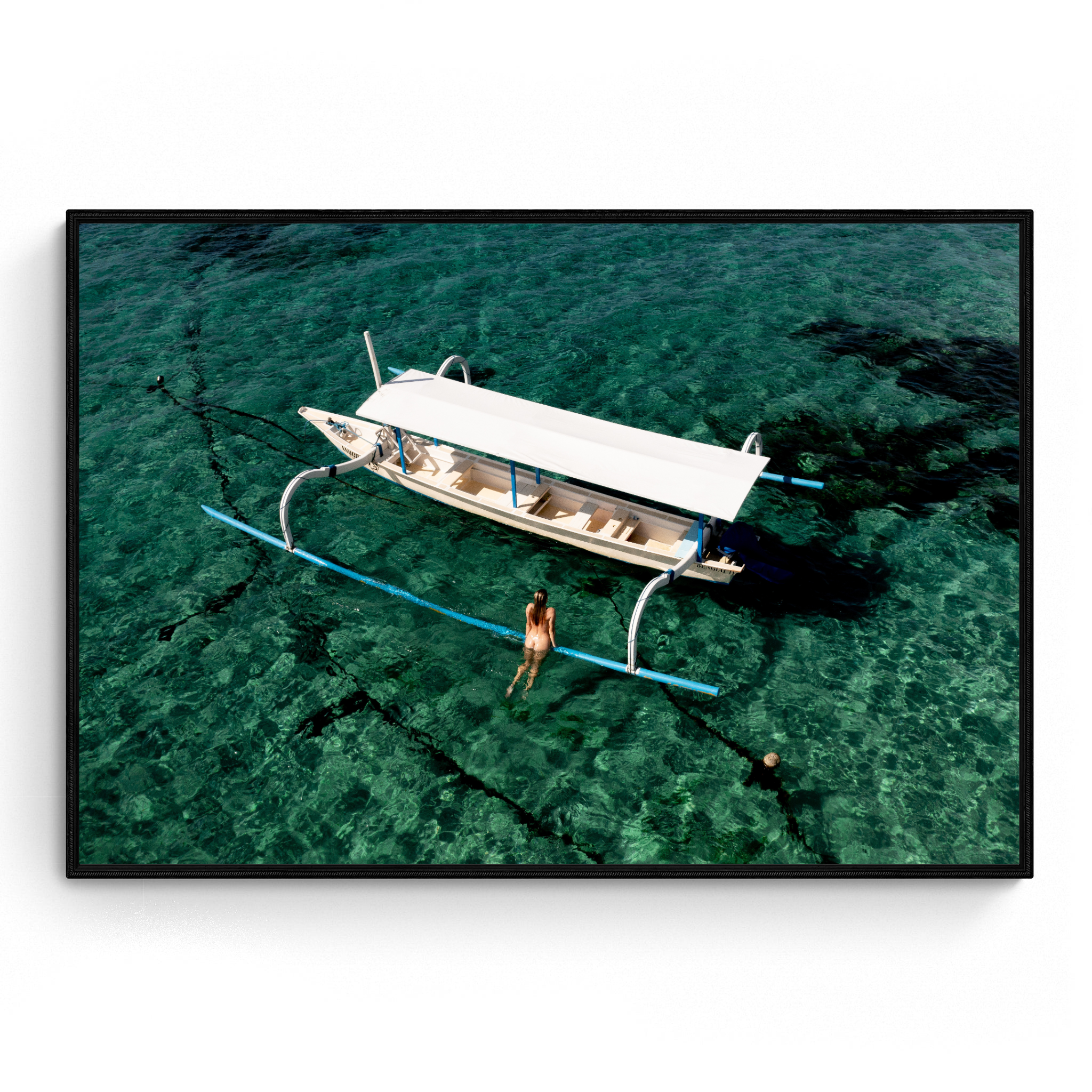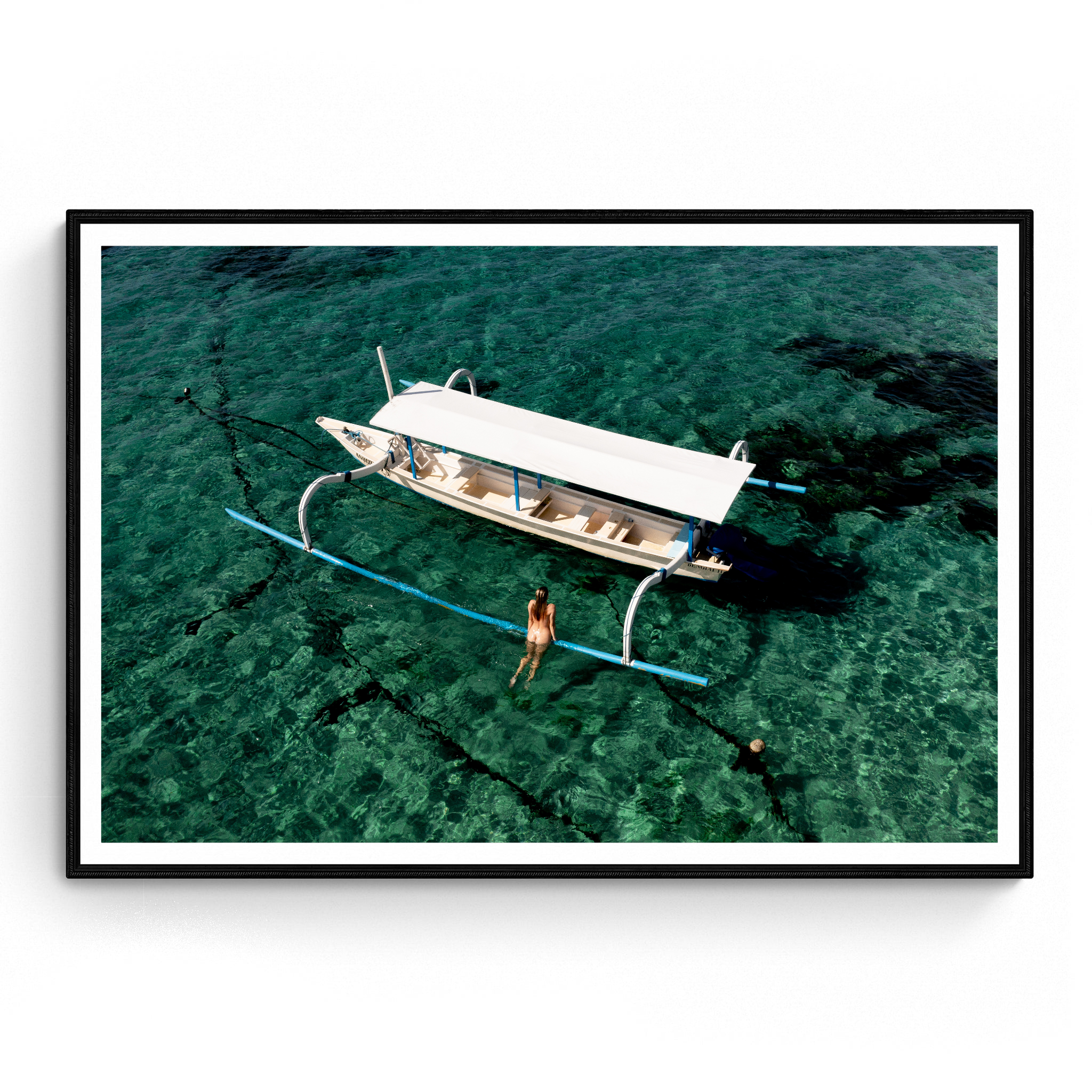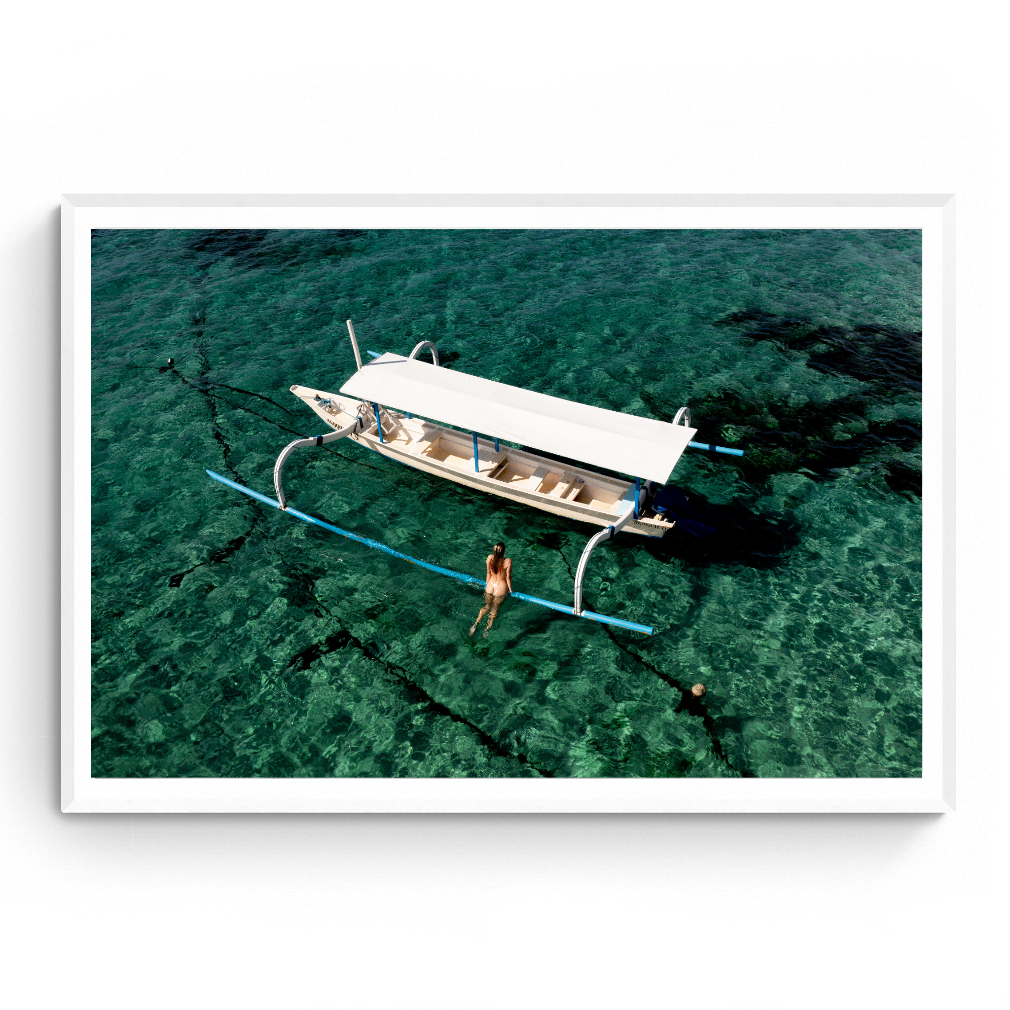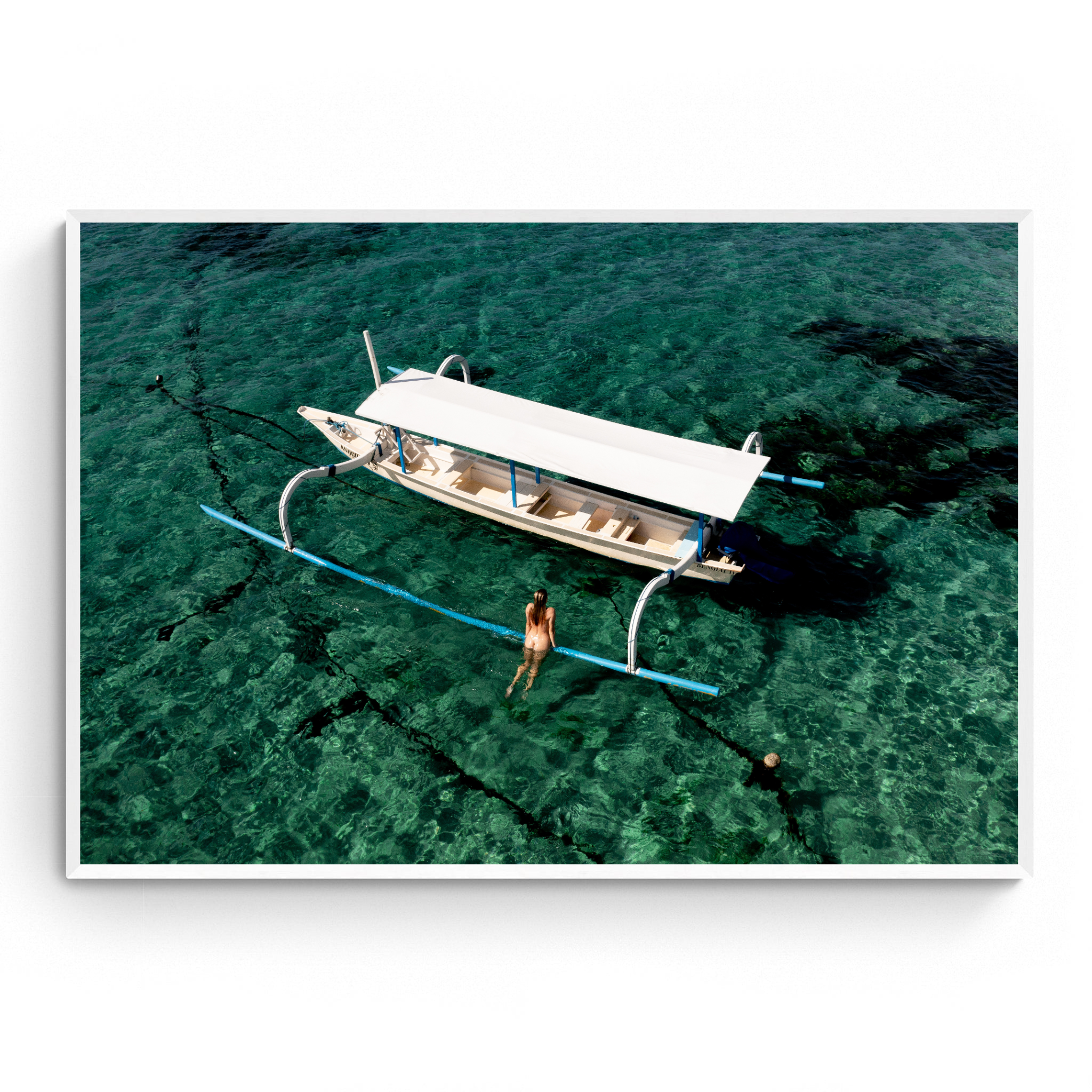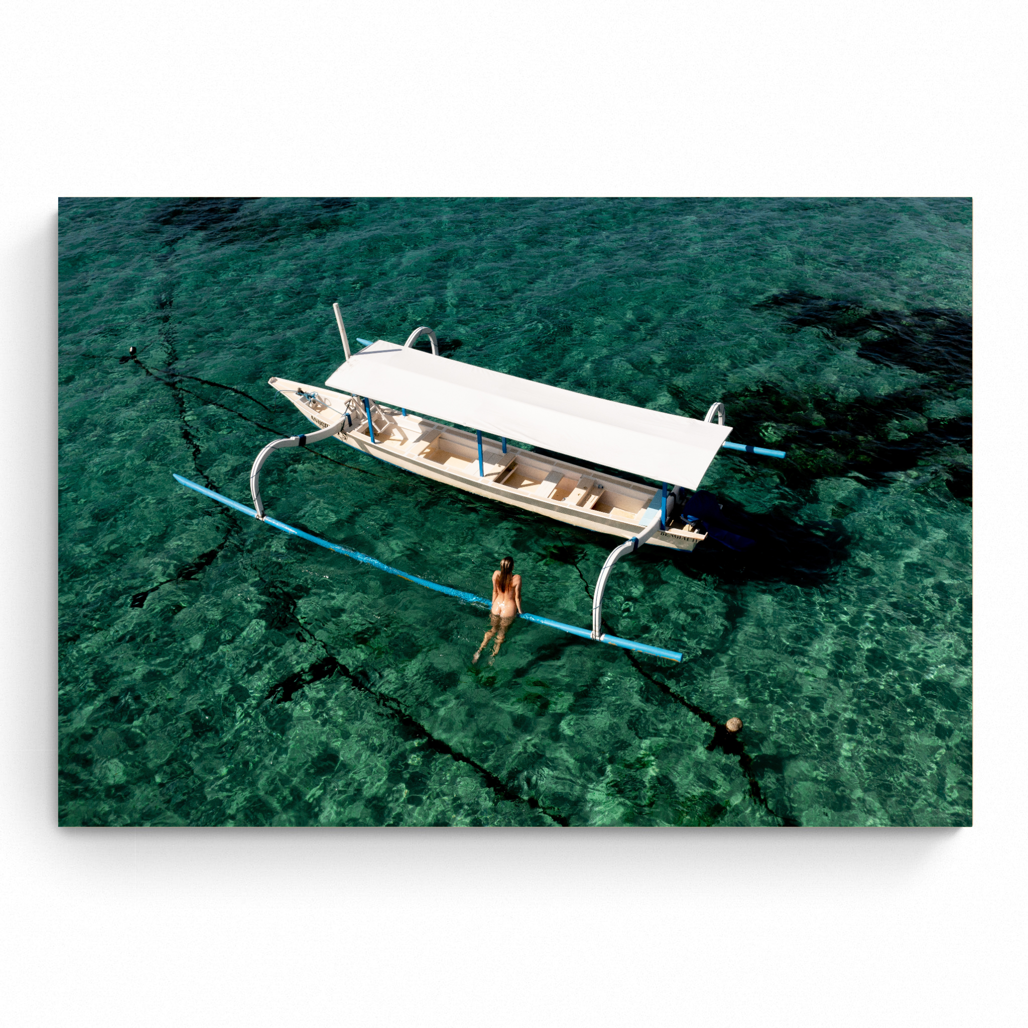 A drift at sea on an early morning swim at Geger beach I captured this swimmer exploring the ocean with a pause on one of Balis fishing boats. The ocean was pristine and some what unreal, I was drawn in after this was taken for a swim myself, an irresistible invitation.