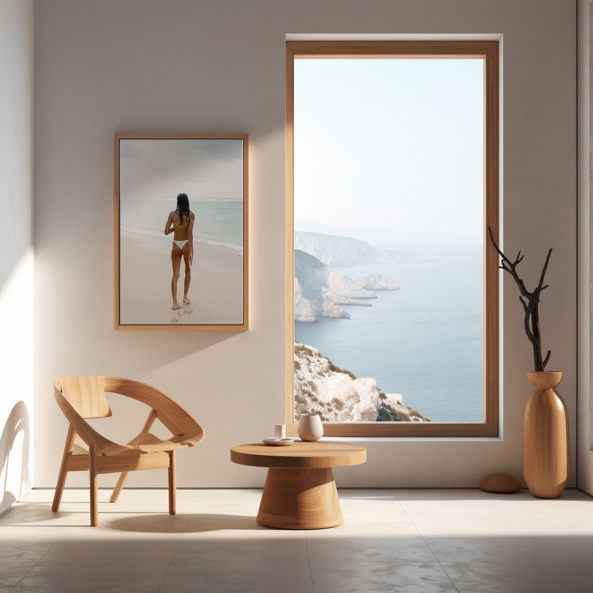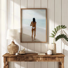 Captures a moment of pure freedom, as she walks topless toward the vast ocean, her body unburdened and open to the embrace of the sea.