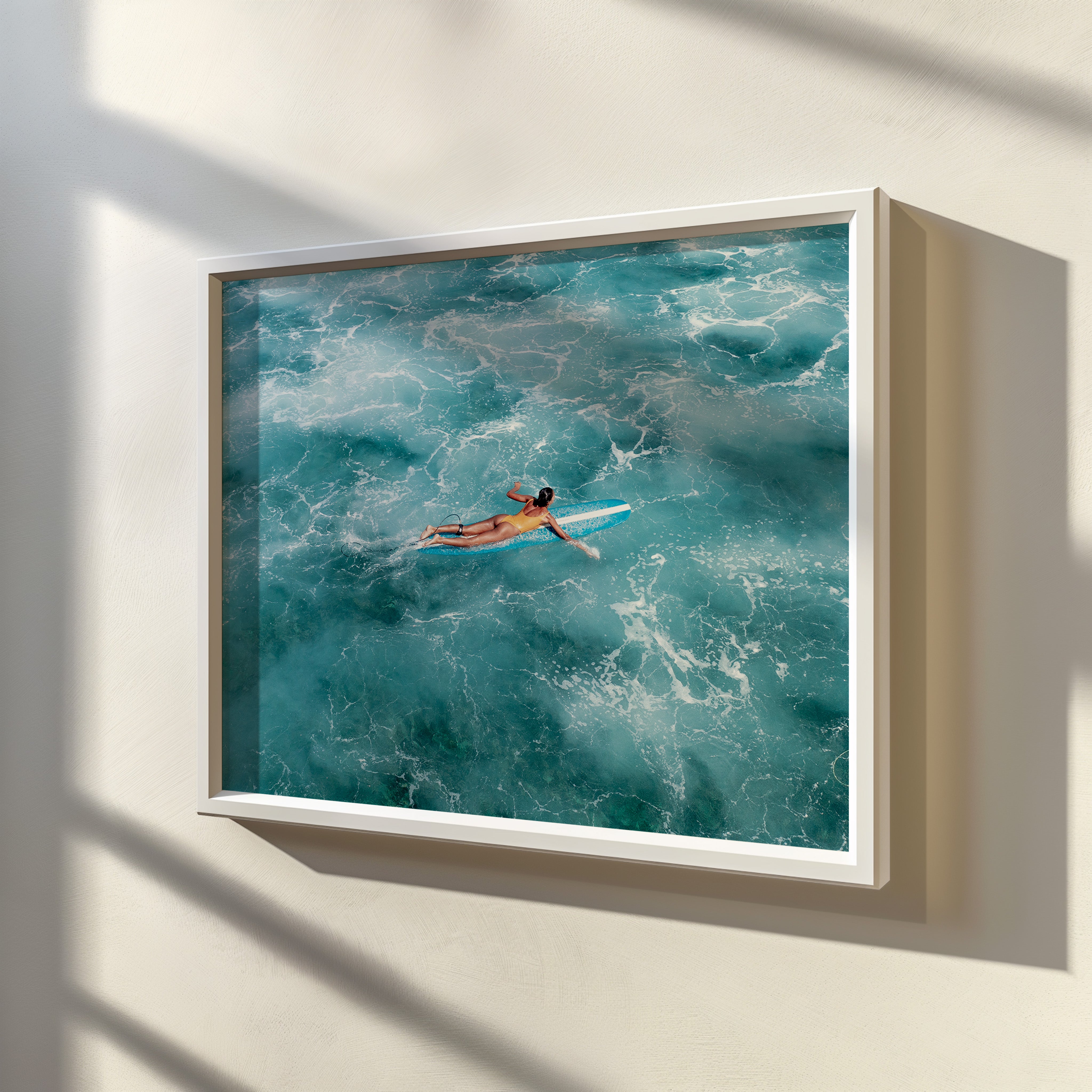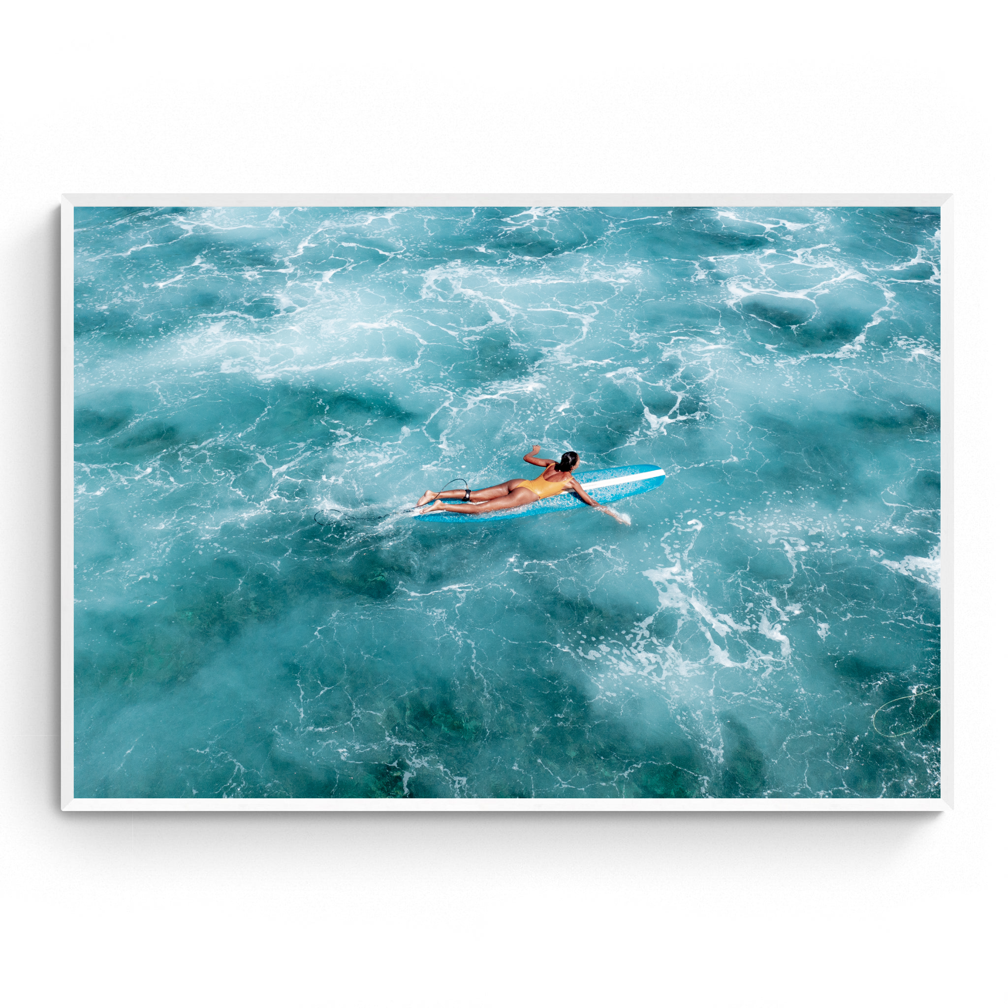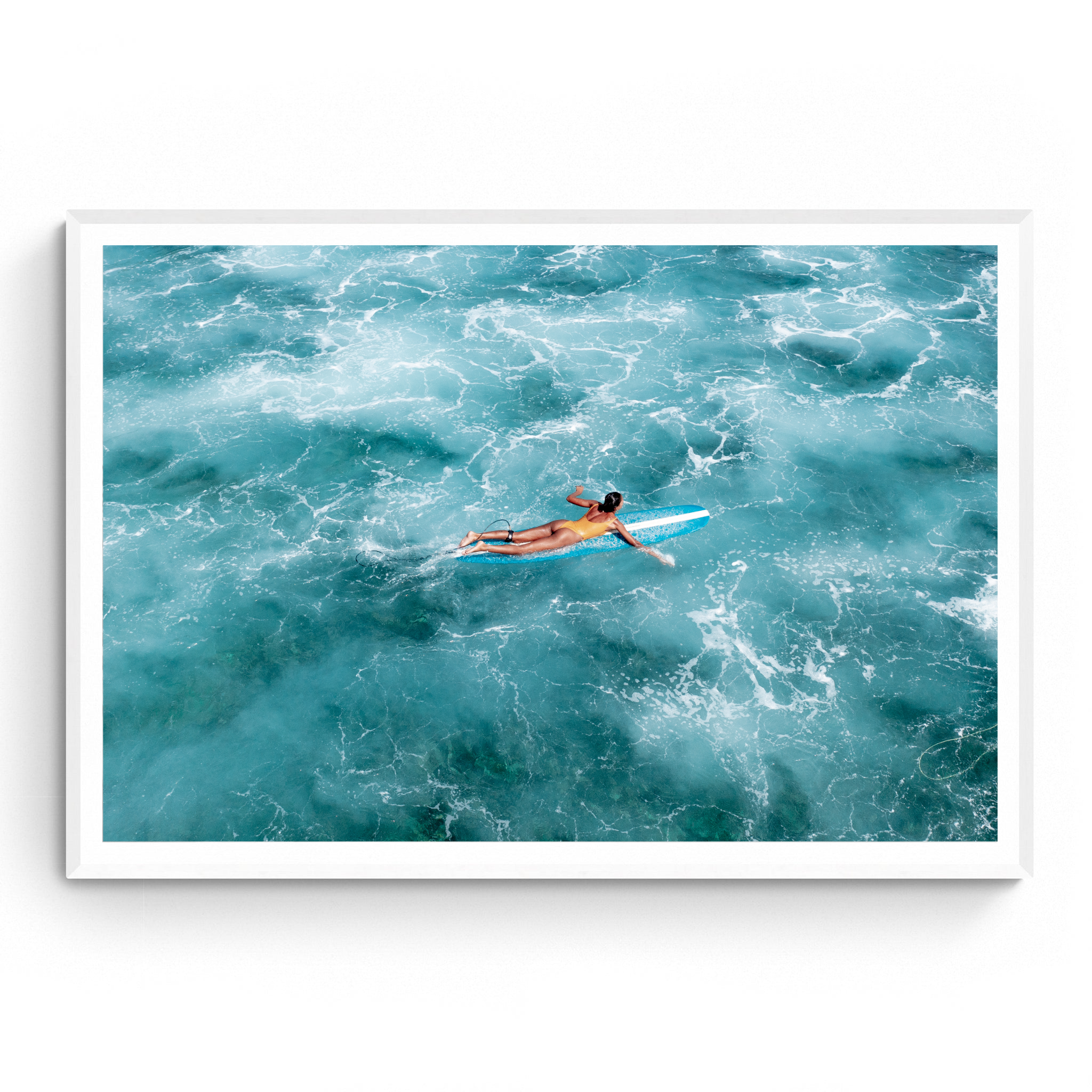 A surfer gracefully paddling through the vibrant turquoise waters of Padang Padang, Bali, immersed in the rhythm of the ocean's gentle currents.