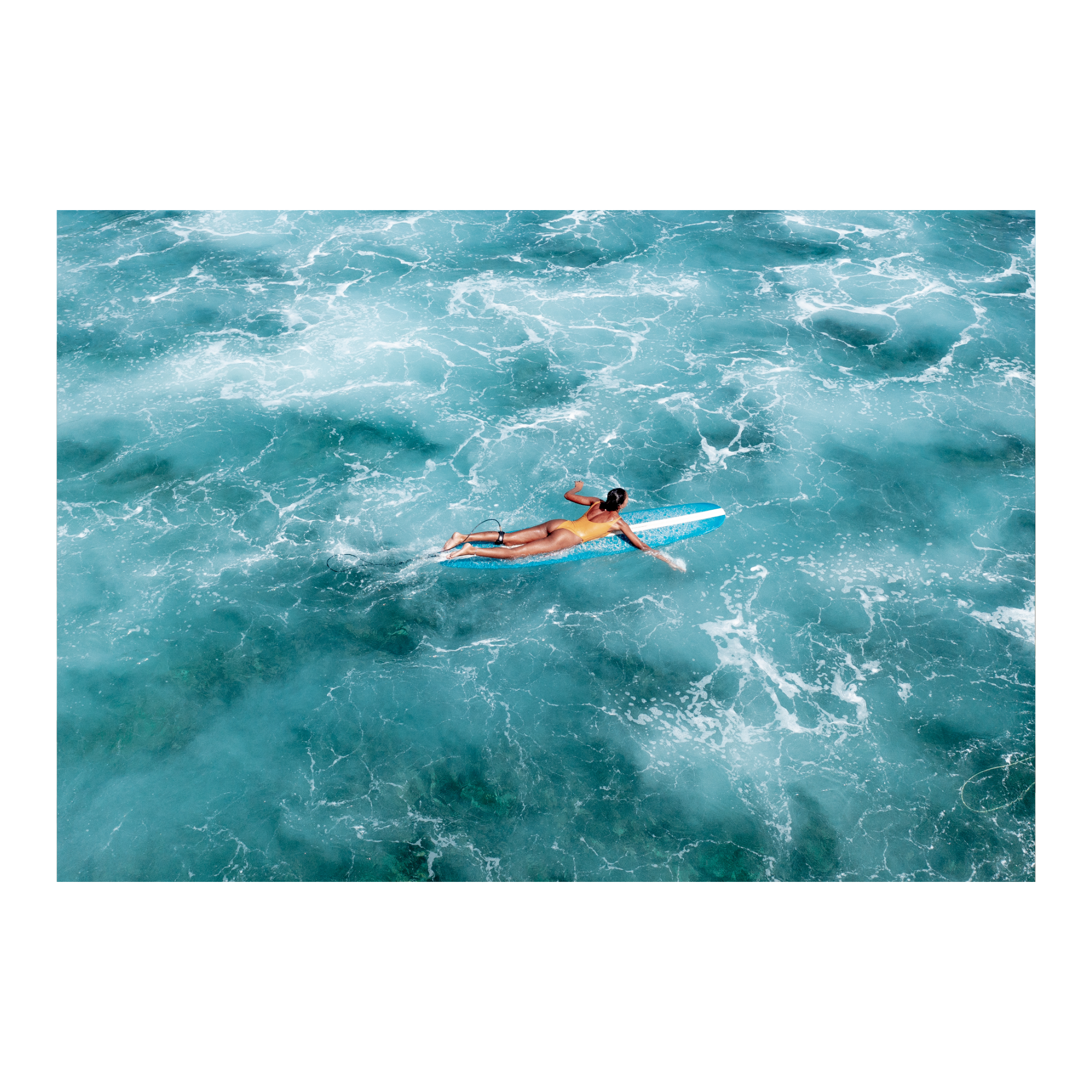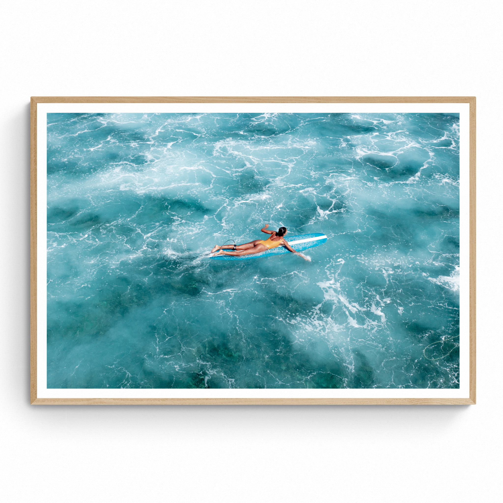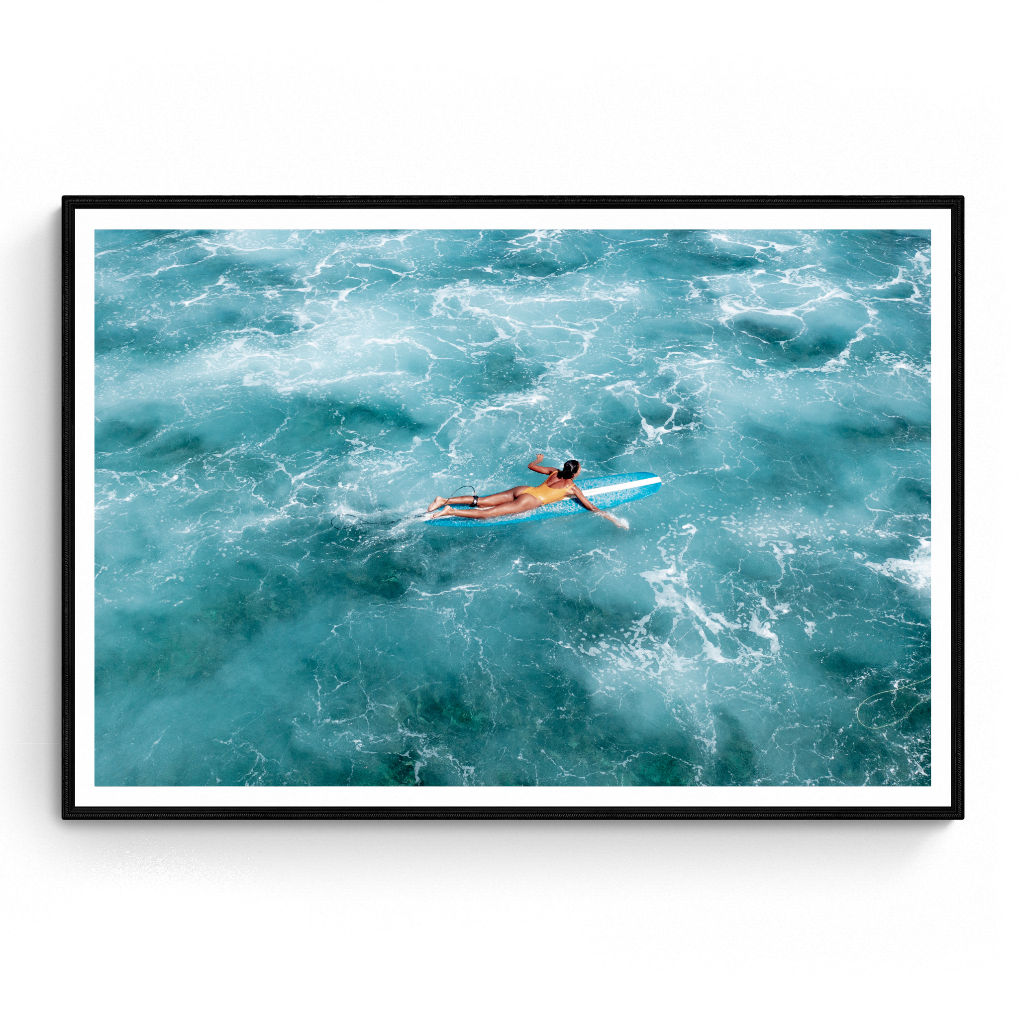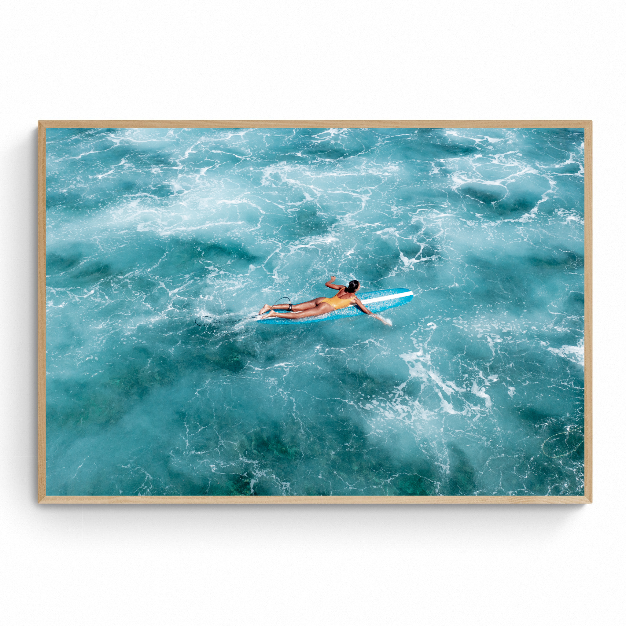 A surfer gracefully paddling through the vibrant turquoise waters of Padang Padang, Bali, immersed in the rhythm of the ocean's gentle currents.