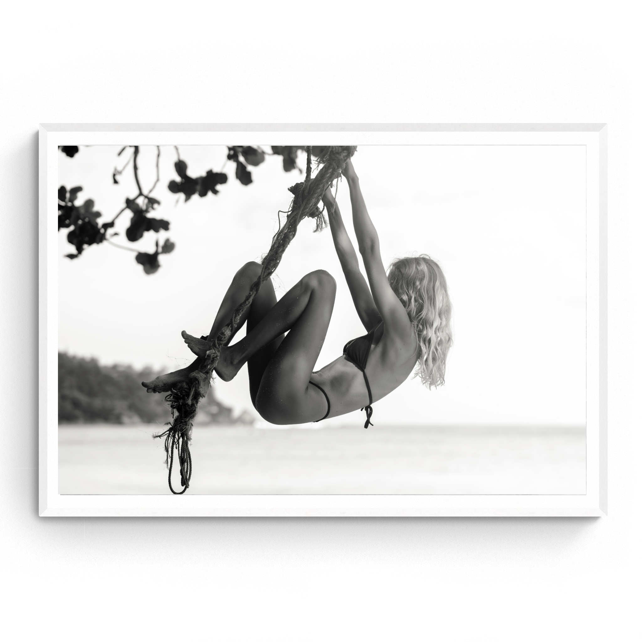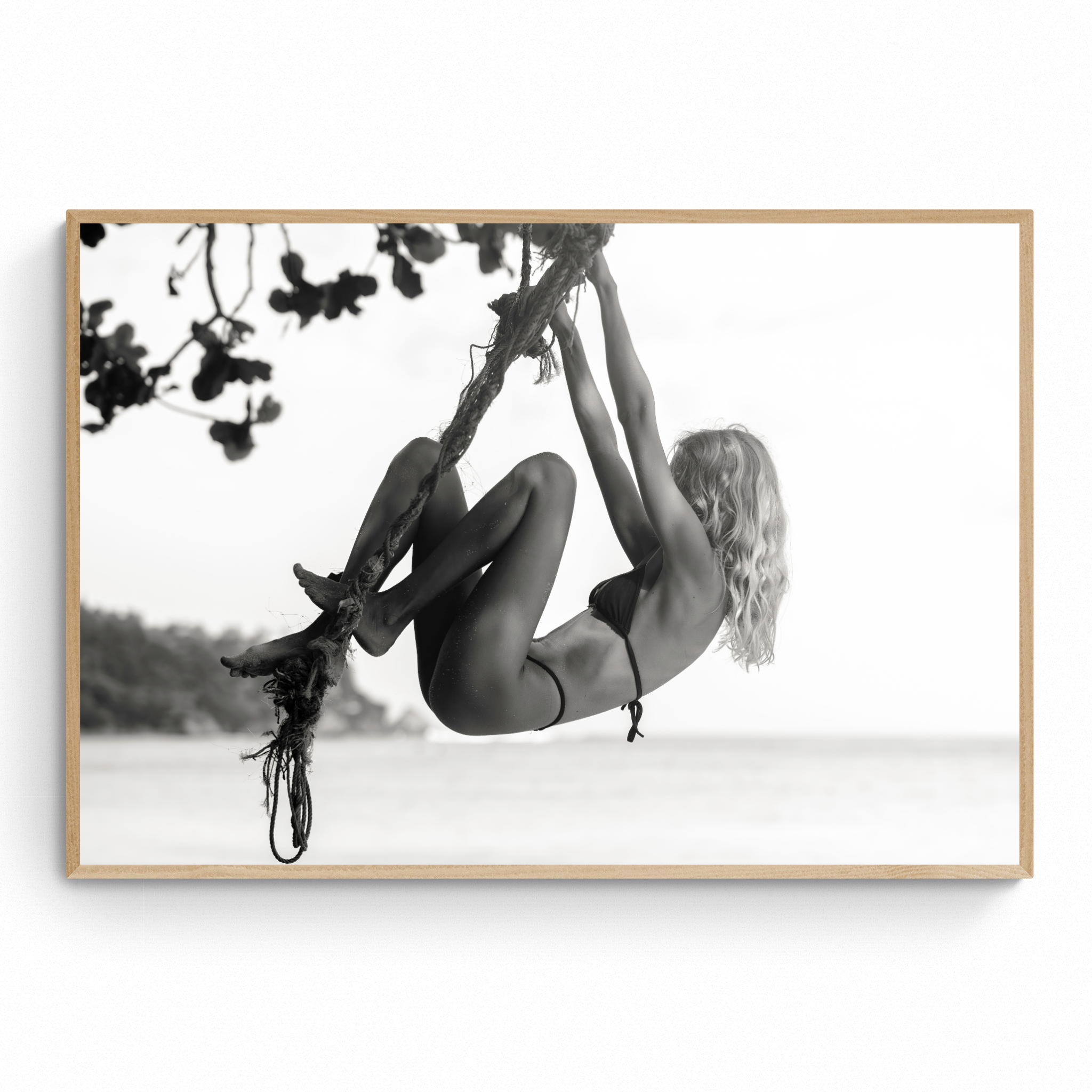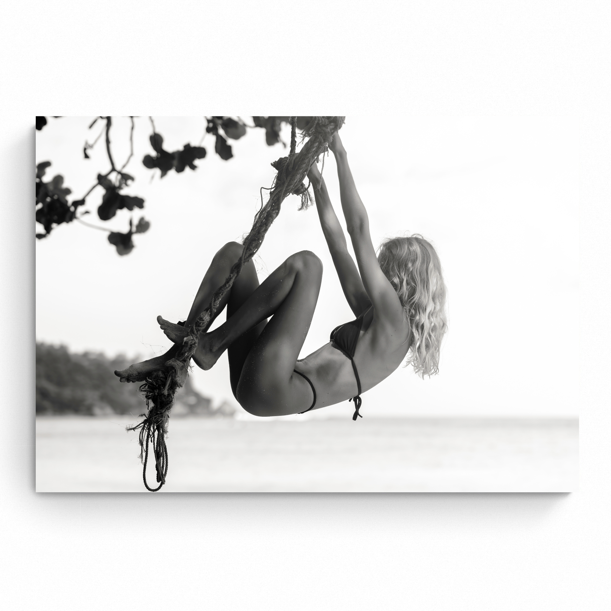 A barefoot girl glides through the air on a rope swing, suspended over Bali’s lush jungle. Her hair flows freely, caught in the warm breeze, as golden light filters through the trees. A moment of pure freedom, weightless and untamed.