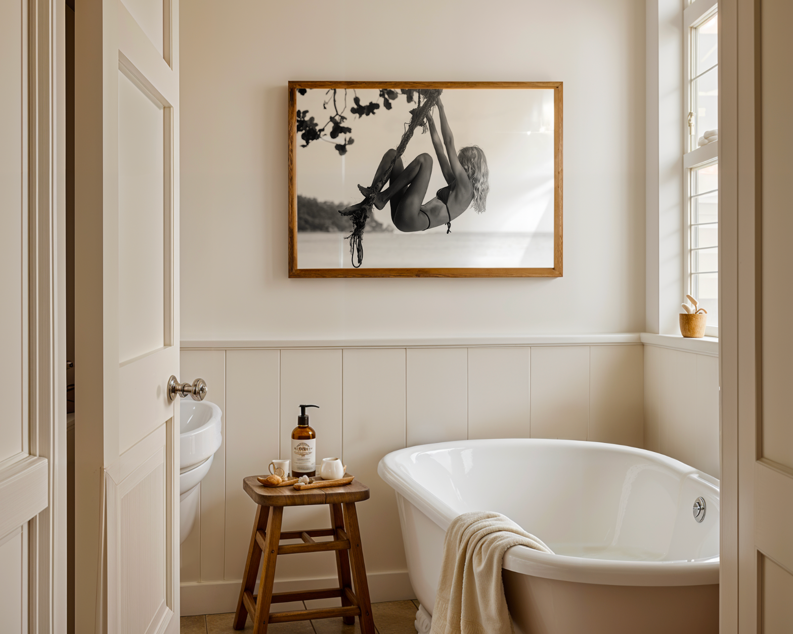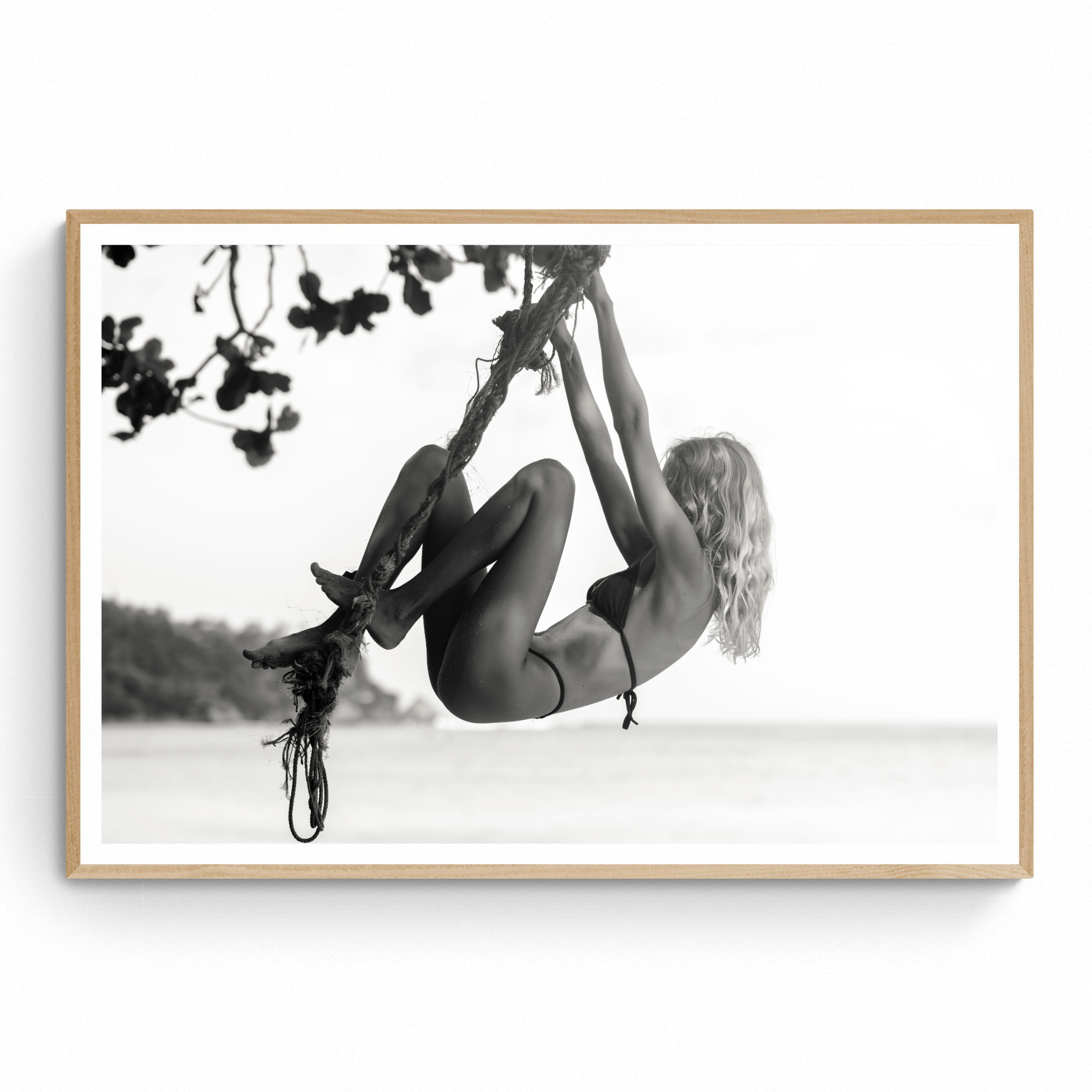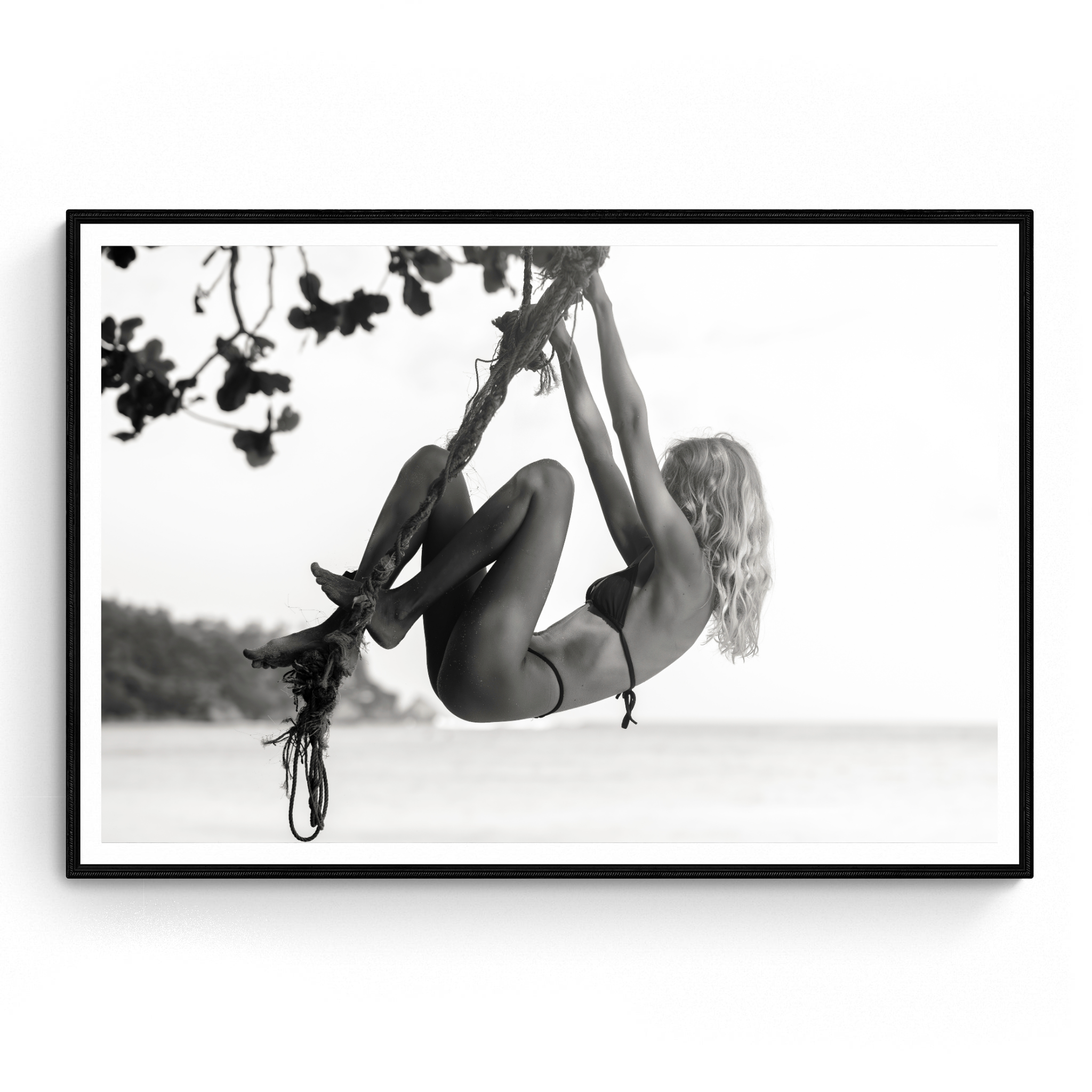 A barefoot girl glides through the air on a rope swing, suspended over Bali’s lush jungle. Her hair flows freely, caught in the warm breeze, as golden light filters through the trees. A moment of pure freedom, weightless and untamed.