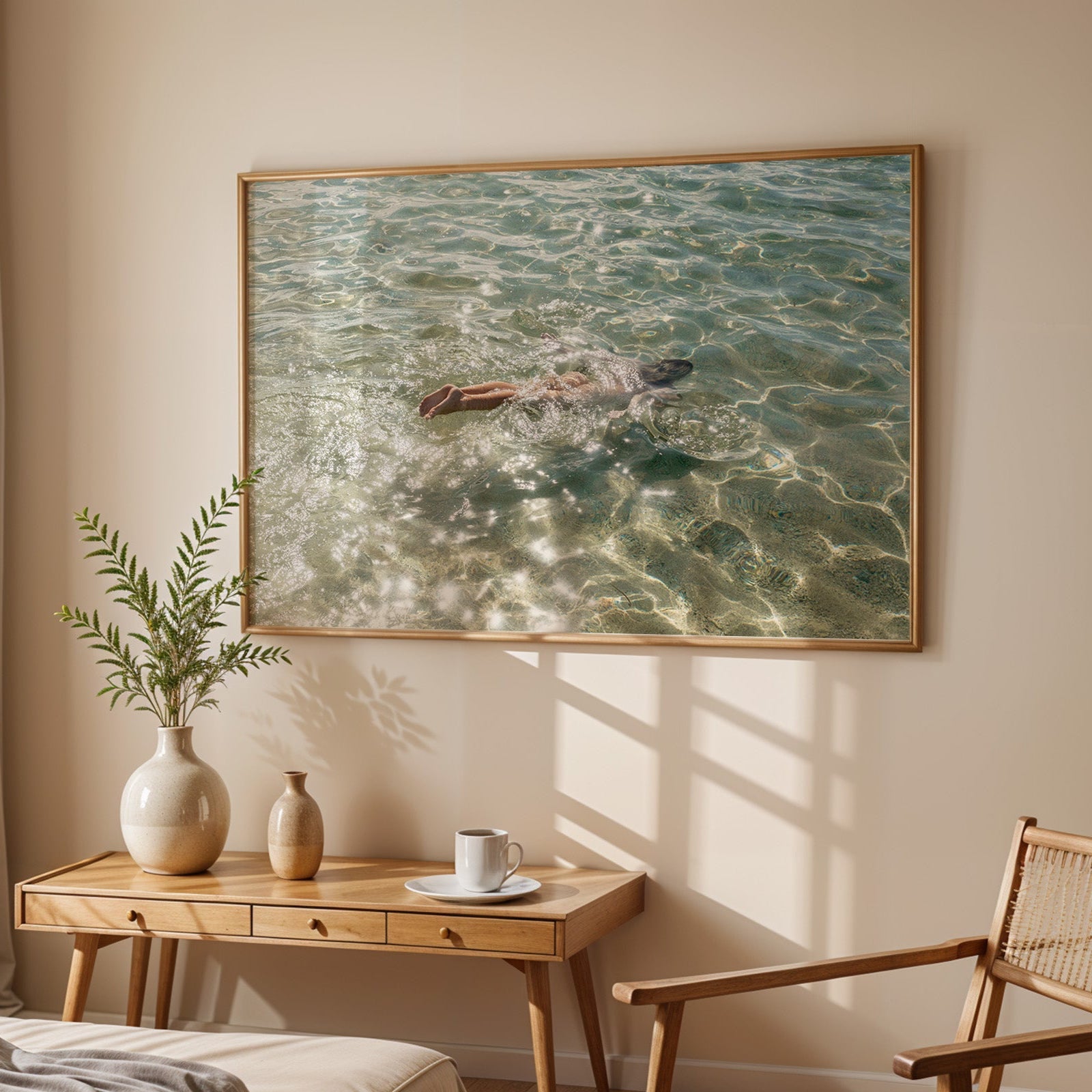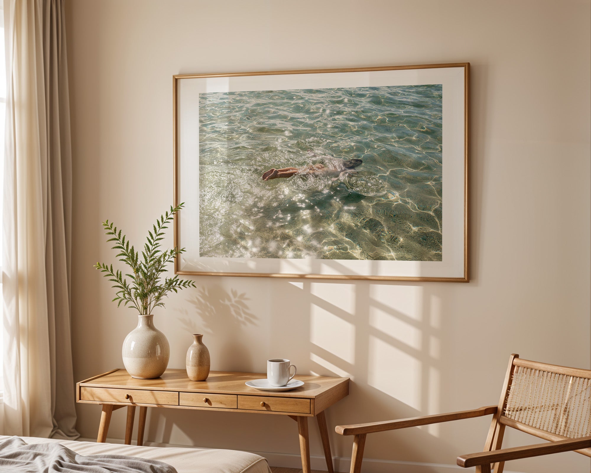 The Restoration captures a moment of pure serenity and strength as a girl glides effortlessly through sunlit, glittering water. This fine art photograph symbolizes healing, rebirth, and the quiet power of nature and femininity. Perfect for ocean lovers and art collectors seeking a piece that radiates calm, resilience, and freedom. Shot in natural light, this image evokes a sense of peace and wonder, making it an ideal statement piece for coastal, minimalist, or bohemian interiors.