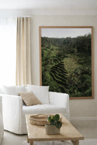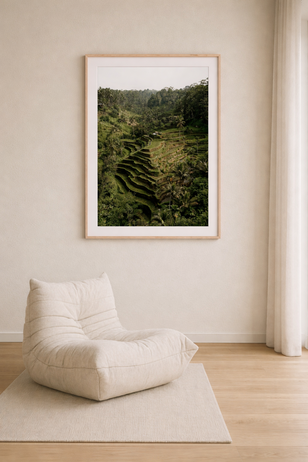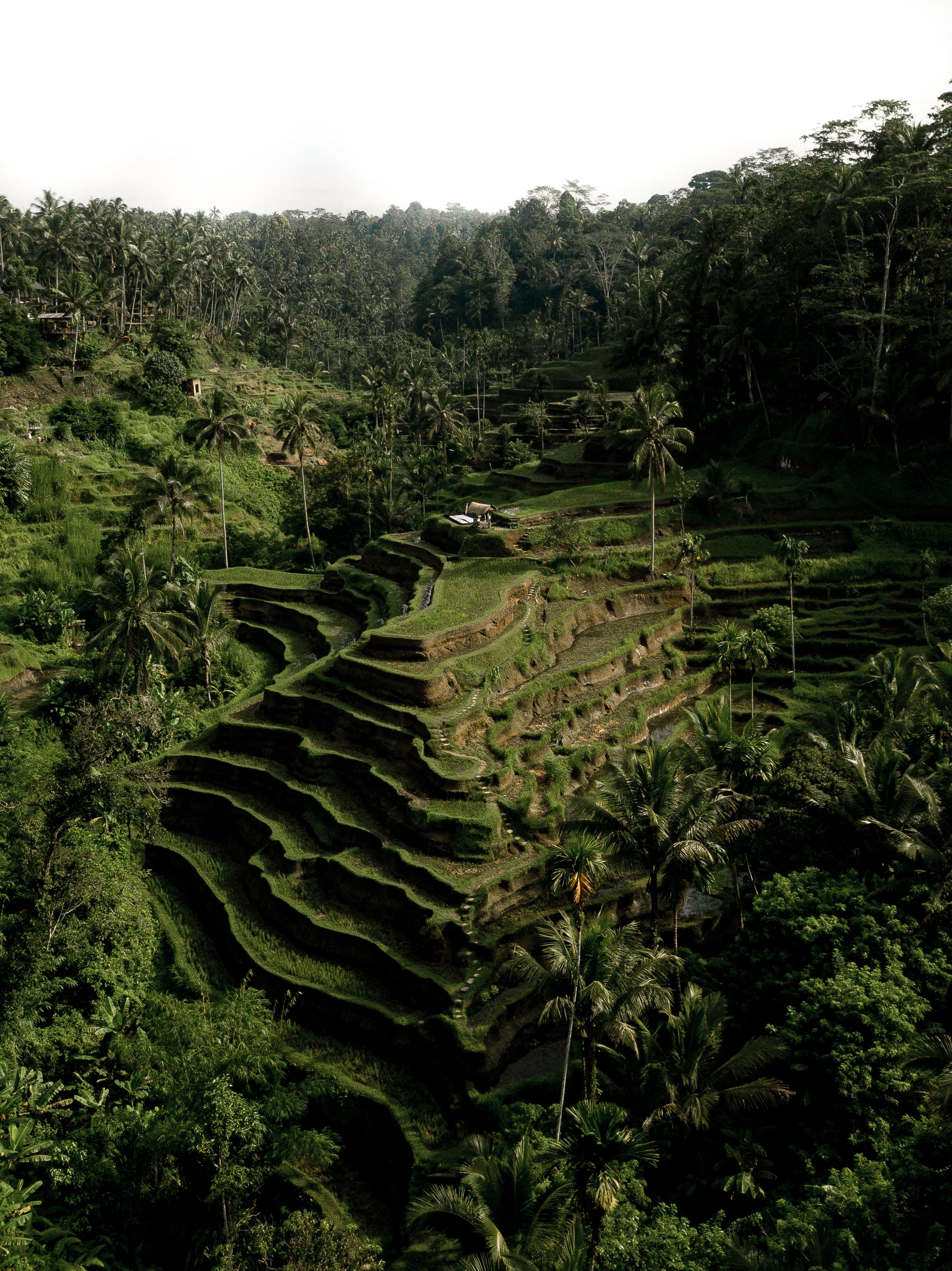 Lush terraced rice fields cascade through the hills of Ubud, creating a timeless landscape of emerald greens and quiet beauty.