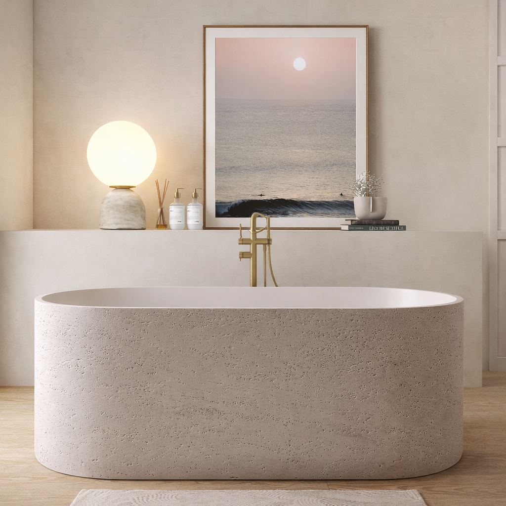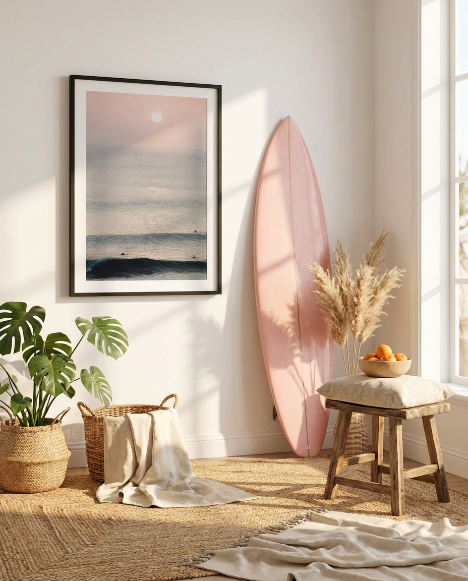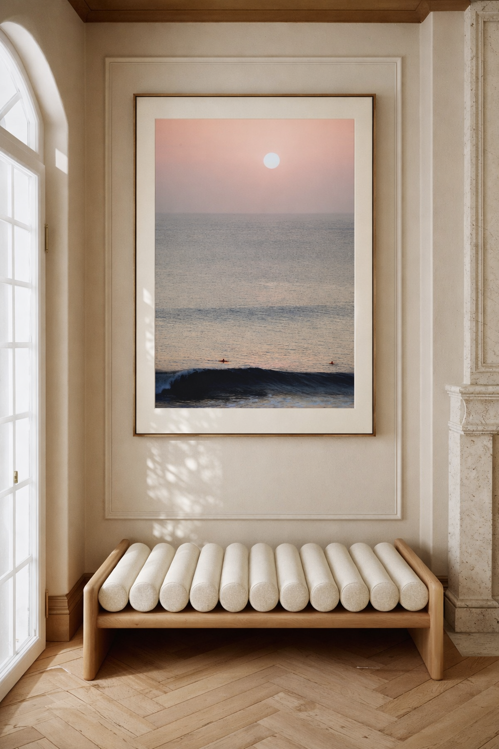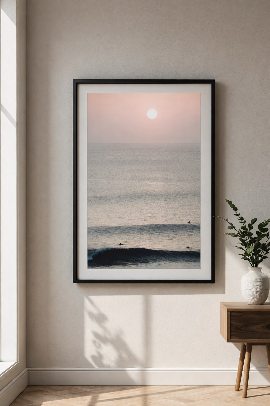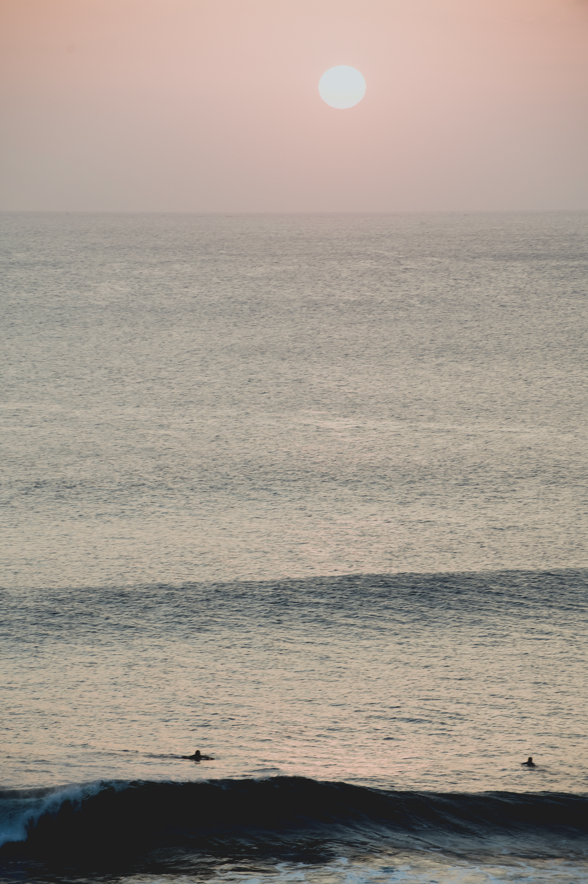 A soft pastel sunset unfolds over the waves at Uluwatu, Bali, where the horizon melts into shades of blush and gold.